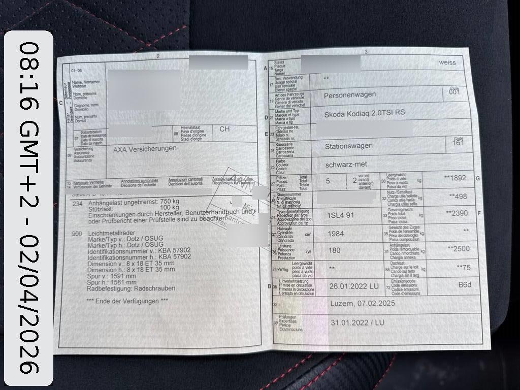 Assist: Geschwindigkeitsregelanlage mit Distanzkontrolle „Adaptive Cruise Control” bis 210 km/h, ESP (Elektronisches Stabilisierungsprogramm) inkl. ABS, EBV, MSR, ASR, EDS, HBA und DSR, Dachreling schwarz, Regensensor mit automatischer Rückspiegelabblendung und Lichtassistent (Coming Home, Leaving Home, Tunnel Light), Heckscheibenheizung, Make up-Spiegel mit LED beleuchteung, Aussenspiegel schwarz, Drittes Bremslicht, Airbag: Airbag Beifahrer deaktivierbar, Fussraumbeleuchtung vorne und hinten, SKODA Garantie: Garantie 3 Jahre gegen Lackschäden (ab 1. Inv.), Getriebe: 7-Gang DSG, Handschuhfach gekühlt und beleuchtet, Variabler Ladeboden im Kofferraum, Assist: Parksensoren vorne und hinten, Nebelschlussleuchte, Media: 8 Lautsprecher, Allradantrieb permanent, Katalysator geregelt, Lenkrad: 3-Speichen-Supersport-Leder-Multifunktionslenkrad mit Schaltwippen,mit roten Ziernähten, Sitze: Mittelarmlehne hinten mit Getränkehalter, Fahrwerk: Progressivlenkung, Heckscheiben-Wisch-/Waschanlage, KESSY (Keyless Access) – Schlüsselloses Schliess- und Startsystem, SunSet (Heckscheibe und hintere Seitenscheiben dunkel getönt), Licht: LED Rückleuchten (mit dynamischem Blinker und Welcome-Effekt), Pedale aus Edelstahl, Tür und Seitenverkleidung mit Regenschirm auf Fahrerseite, Türgriffe aussen in Wagenfarbe, Höhenverstellbare Gurten vorne, Brillenfach, Sitze: Mittelarmlehne vorne, Polster: Sitzbezüge Suedia/Leder für RS (Kombination aus Suedia, Leder und hochwertigen Materialien), LED Plus Paket (LED Ambiente Beleuchtung, Dekoreinlage am Armaturenbrett, LED Dachbeleuchtung, LED Makeupspiegel, Logo Projektion an Türen, Fussraumbeleuchtung, Türablagefachbeleuchtung vorne), Airbag: Kopfairbags inkl. Seitenairbags vorne, Dekor: Dekoreinlage am Armaturenbrett Carbon-Design, Sitze: Elektrisch einstellbarer Fahrersitz mit Memoryfunktion – Lendenwirbelstütze elektrisch einstellbar, (Entfall des Ablagefachs unter dem Fahrersitz), Media: Infotainment Online 3 Jahre + „Care Connect” (Remote Access 3 Jahre), Media: Dynamisches Navigationssystem AMUNDSEN mit 8″-Farb-Touchscreen, DAB+ Empfänger und Webradio, Sprachbedienung, „SmartLink” , Kartenmaterial Europa und Infotainment Online 3 Jahre; Telefonvorbereitung mit Phonebox und Wireless Charging (Verbindung über die Aussenantenne), WLAN und LTE Antenne für High Speed Internet., Räder: Leichtmetallräder 8,0 J x 20″ „SAGITARIUS” , anthrazit mit polierter Oberfläche und AERO Deck 235/45 R20, Assist: Emergency Call (Notruf), Servolenkung, Elektrische Fensterheber vorne + hinten mit Einklemmschutz, Elektrische Heckklappe, Gurtstraffer vorne, Pollenfilter (Staubfilter), Fahrwerk: Adaptive Fahrwerksregelung „DCC – Dynamic Chassis Control” inkl. Offroad-Assistent und- Progressivlenkung, Assist: Front Assistant inkl. City-Notbremsfunktion, 3-Punkt-Sicherheitsgurte auf allen Plätzen, Räder: Reifendruckkontrollsystem, Wegfahrsperre elektronisch, Virtuelles Cockpit, Airbag: Knie-Airbag für Fahrer, Assist: Rückfahrkamera, Media: SmartLink (wireless connect für Apple), Vorbereitung für Anhängerkupplung, Räder: Pannenset (Kompressor und Flasche mit Dichtmittel, ohne Reserverad), 12 Volt-Steckdose im Laderaum, Gurtanlegesignalisation für alle Passagiere, Sitze: 3 Kopfstützen hinten, SKODA Garantie: Garantie 12 Jahre gegen Durchrostungs (ab 1. Inv.), SKODA Garantie: Garantie 2 Jahre ohne Kilometerbegrenzung (ab 1. Inv.), Textilfussmatten, Scheibenwaschdüsen beheizt, Assist: Berganfahrassistent, Licht: Voll LED Scheinwerfer mit „Matrix-Beam-Funktion” und AFS (Adaptive Frontlight System)- inkl. „Corner Funktion” und Welcome Effekt, Sitze: Vordersitze heizbar, Klima: Climatronic 2-Zonen-Temperaturregelung, vollautomatisch, getrennt regelbar, Sitze: Sportsitze, Akustikpaket mit SunSet (Seitenscheiben vorn geräuschdämmend, erweiterte Innengeräuschdämmung), Aussenspiegel elektrisch einstell-, beheiz- und anklappbar mit – automatischer Abblendung auf Fahrerseite und Einsteigebeleuchtung und Memoryfunktion