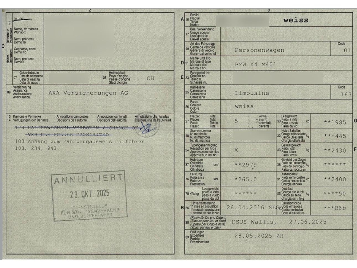 | Fahrzeugausweis | Vorhanden |