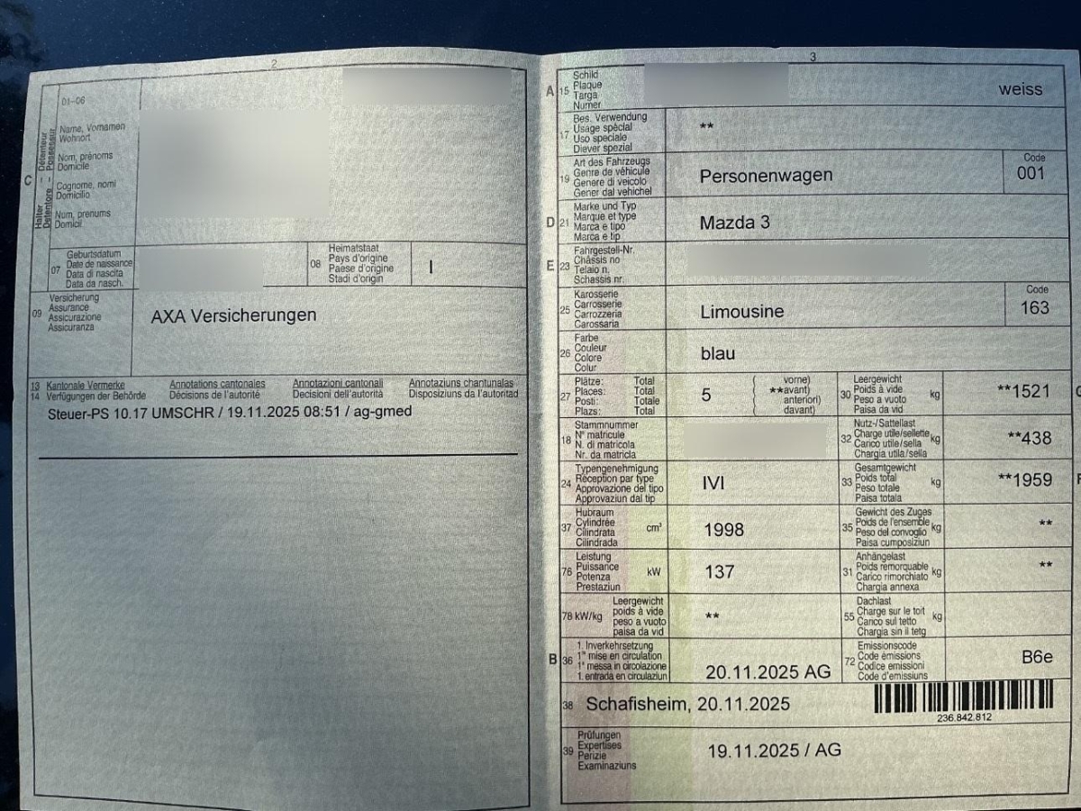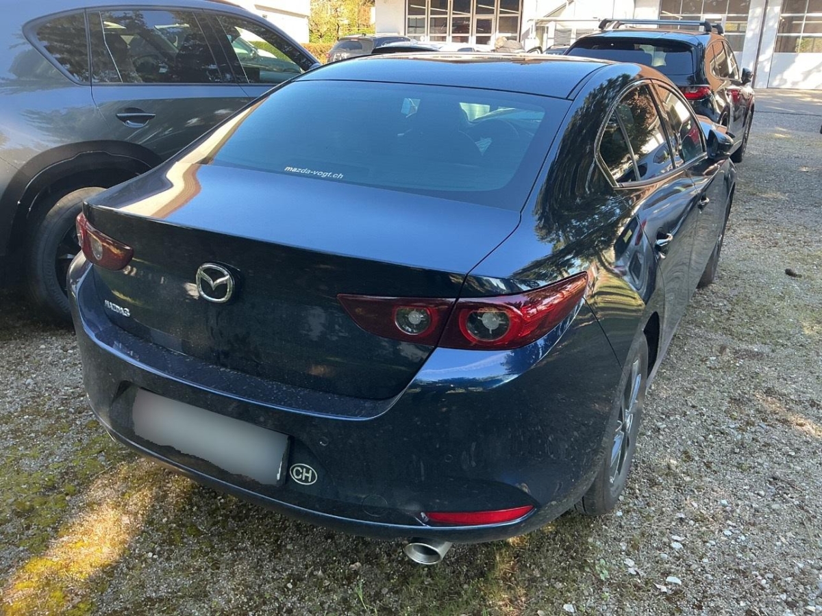 ABS, Ablagetasche (Rückseite Beifahrersitz), Airbag: Airbag Fahrer und Beifahrer, Airbag: Fahrer-Knie-Airbag, Airbag: Seitenairbag für Fahrer und Beifahrer, Airbag: Vorhang vorn-hinten, Alarmanlage, Assist: Adaptive Geschwindigkeitsautomatik MRCC (Mazda Radar Cruise Control) mit Stop & Go-Funktion, Assist: City-Notbremsassistent SCBS mit Fussgänger- und Fahrraderkennung, Assist: Dynamische Stabilitätskontrolle (DSC) und Traktionskontrolle (TCS), Assist: Einparkhilfe mit Parksensoren hinten, Assist: Einparkhilfe mit Parksensoren vorne, Assist: Elektronische Parkbremse mit Auto-Hold-Funktion und Berganfahrhilfe, Assist: Intelligente Geschwindigkeitsautomatik und Geschwindigkeitsbegrenzer mit Verkehrszeichen -erkennung, Assist: Pre-Crash Safety mit aktivem Bremseingriff SBS (Smart Brake Support), Assist: Rückfahr-Querverkehrswarner (RCTA, Rear Cross Traffic Alert), Assist: Spurhalteassistent LAS (Lane-keep Assist System) mit aktiver Lenkunterstützung, Assist: Spurwechselassistent (BSM, Blind Spot Monitoring) mit Totwinkelwarner, Assist: Verkehrszeichenerkennung (TSR, Traffic Sign Recognition), Aussenspiegel automatisch abblendend auf Fahrerseite, Aussenspiegel beheizbar und automatisch einklappbar, Aussenspiegel in Wagenfarbe, Aussenspiegel rechts mit automatischer Absenkfunktion zum Rückwärtsfahren, Bordcomputer, Dachhimmel in Grau, Elektrische Fensterheber vorn und hinten mit Automatikfunktion, Fahrwerk: G-Vectoring Control Plus, die Fahrdynamikregelung von Mazda, Garantie: Mazda-Garantie 6 Jahre/150 000 km, Getriebe: 6-Gang-Automat, Head-up-Display mit Projektion auf die Windschutzscheibe, Innenspiegel mit automatischer Abblendung, Isofix-Kindersitzverankerungen (2x), Keyless Entry mit Smart Key, Klima: 2-Zonen-Klimaautomatik mit Ventilation hinten, Kosmetikspiegel auf Beifahrerseite und Fahrerseite, beide beleuchtet, LED-Innenbeleuchtung, Lackierung: Uni-Lackierung, Lederlenkrad und -schaltknauf, Lenkrad: Lenkrad beheizbar, Lenkrad: Lenkrad längs- und höhenverstellbar, Lenkrad: Multifunktionslenkrad, Licht: Fernlichtautomatik (HBC, High-Beam Control), Licht: LED-Rückleuchten, Licht: Lichtautomatik, Licht: Scheinwerfer mit Coming-/Leaving-Home-Funktion, Licht: Voll-LED-Scheinwerfer, Mazda M Hybrid Boost, Mild-Hybridsystem (M-HEV) mit Bremsenergie-Rückgewinnung, Media: Apple CarPlay wireless und Android Auto wireless, Media: Audiosystem mit DAB+-Radio, 2x USB- C- und 12-V-Anschluss, Media: Bluetooth für Smartphones und Audiogeräte, Media: Instrumentenanzeige mit 7′-TFT-Multidisplay, Media: Mazda Connect mit 10,25′-TFT-Farbdisplay, Media: Mazda Connected Services, Media: Multi Commander HMI auf der Mittelkonsole, Media: MyMazda App, Media: Navigationssystem, Media: Wireless-Ladestation (für Smartphones mit Qi-Standard), Mittelarmlehne vorne mit Ablagefach, Motor-Startknopf, Paket: Design Pack, Paket: Driver Assistance & Sound Pack, Polster: Ledersitze, perforiert, Räder: Leichtmetallfelgen 18" Farbe Bright Silver 215/45 R18, Räder: Reifendruckkontrollsystem, Räder: Reifenreparatur-Set (Tire Fit), Scheibenwischer mit Enteiser-Funktion, Scheibenwischer mit Regensensor, Scheibenwischer mit integrierter Waschdüse, Servolenkung, Sitze: Beifahrersitz höhenverstellbar, Sitze: Fahrersitz elektrisch verstellbar (5-fach) und mit Memory-Funktion für Sitzeinstellung, – Aussenspiegel und Head-up-Display, Sitze: Fahrersitz in Höhe und Sitzkissen in Neigung verstellbar, Sitze: Fahrersitz mit einstellbarer Lendenwirbelstütze, Sitze: Rücksitzlehnen getrennt abklappbar 60:40, Sitze: Vordersitze heizbar, Zentralverriegelung mit Fernbedienung, eCall, i-stop, das intelligente Stopp-Start-System von Mazda