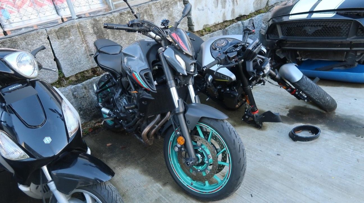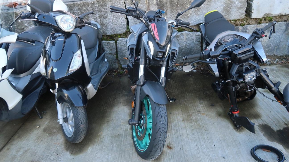 Brandschaden. Das Motorrad stand in der Nähe des Brandherds und ist voller Russ.